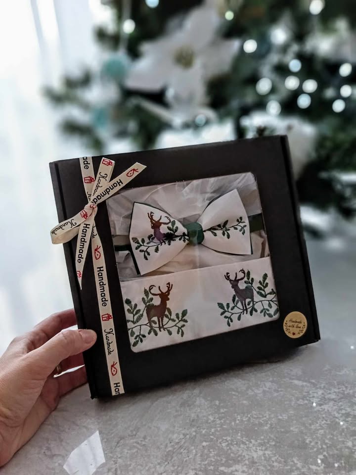 Darčeková kazeta. Obsahuje dámsky poľovnícky opasok a pánsky poľovnícky motýlik. Opasok je na viazanie, takže pekne sadne. Motýlik má regulovateľné zapínanie. Prispôsobí sa. Krásny vyšívaný set pre pár. Vhodný na akúkoľvek spoločenskú udalosť, ale aj ako milý darček, ktorý určite poteší.
