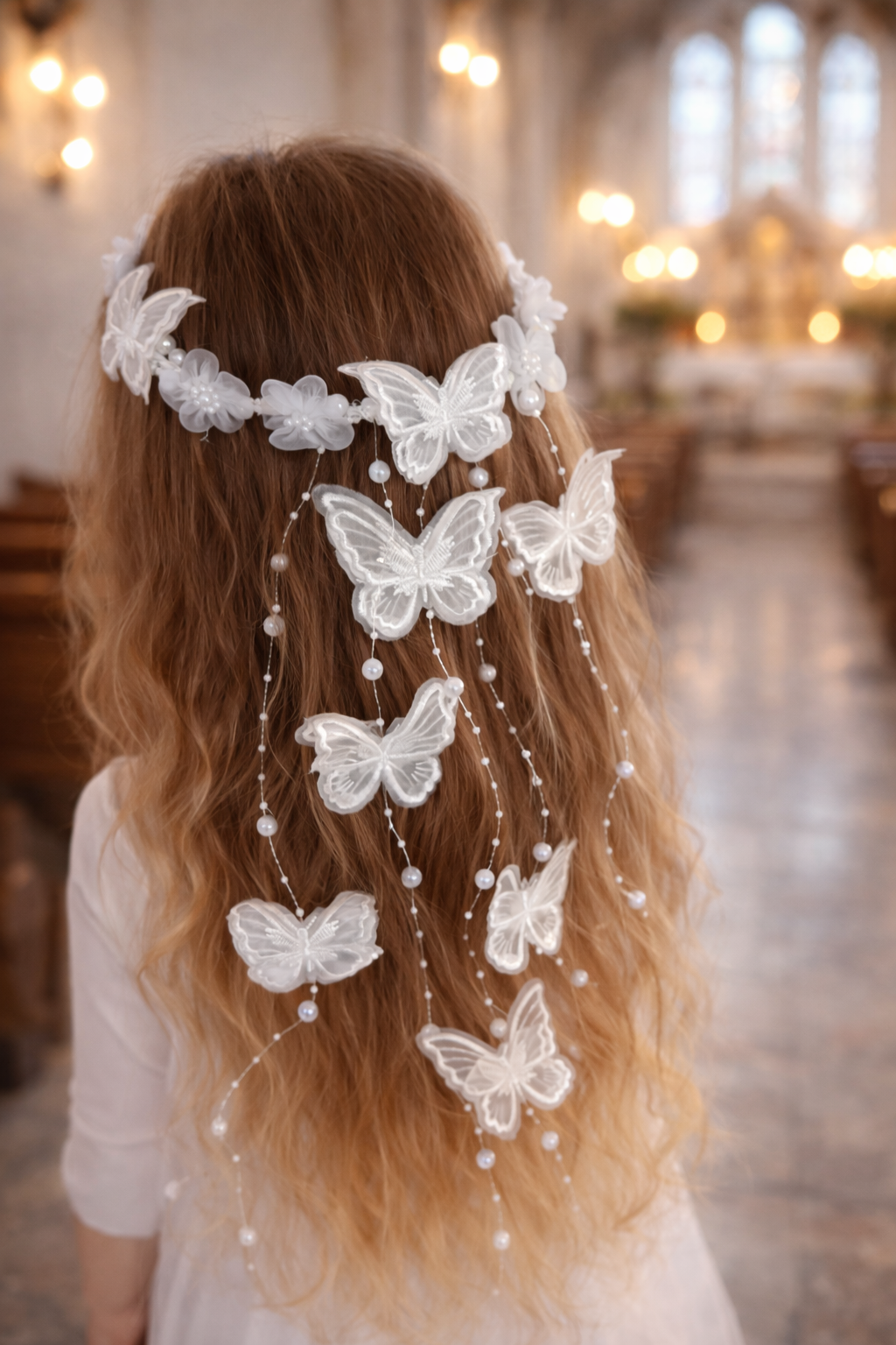 Romantický nežný vlasový doplnok s perličkami a motýlikmi, ktoré vytvárajú luxusný vzhľad. Pre dievčatá na prvé sväté prijímanie, svadbu. Farba: biela. Krásne vynikne na vlasoch, či už na rozpustených alebo učesaných. Je ľahká, super sa nosí. Dodajte účesu rozprávkový nádych.