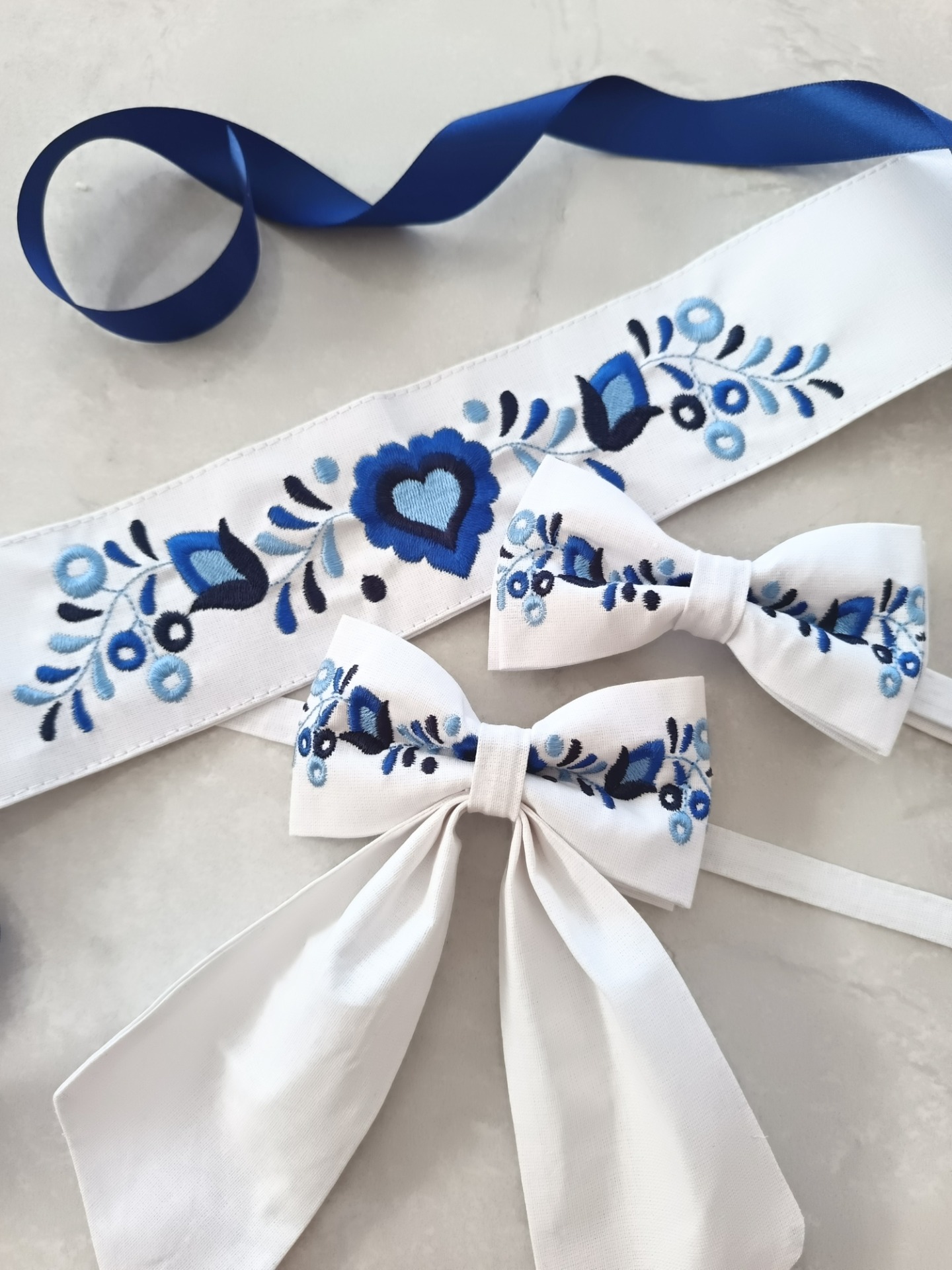 Spojenie tradície, elegancie a romantickej farebnosti – to je náš folklórny vyšívaný set v odtieňoch bielej, modrej . Tento jedinečný komplet obsahuje dámsky vyšívaný opasok, dámsku mašľu a pánsky motýlik, vytvorený pre páry, ktoré chcú ladiť v duchu slovenskej tradície a štýlu.